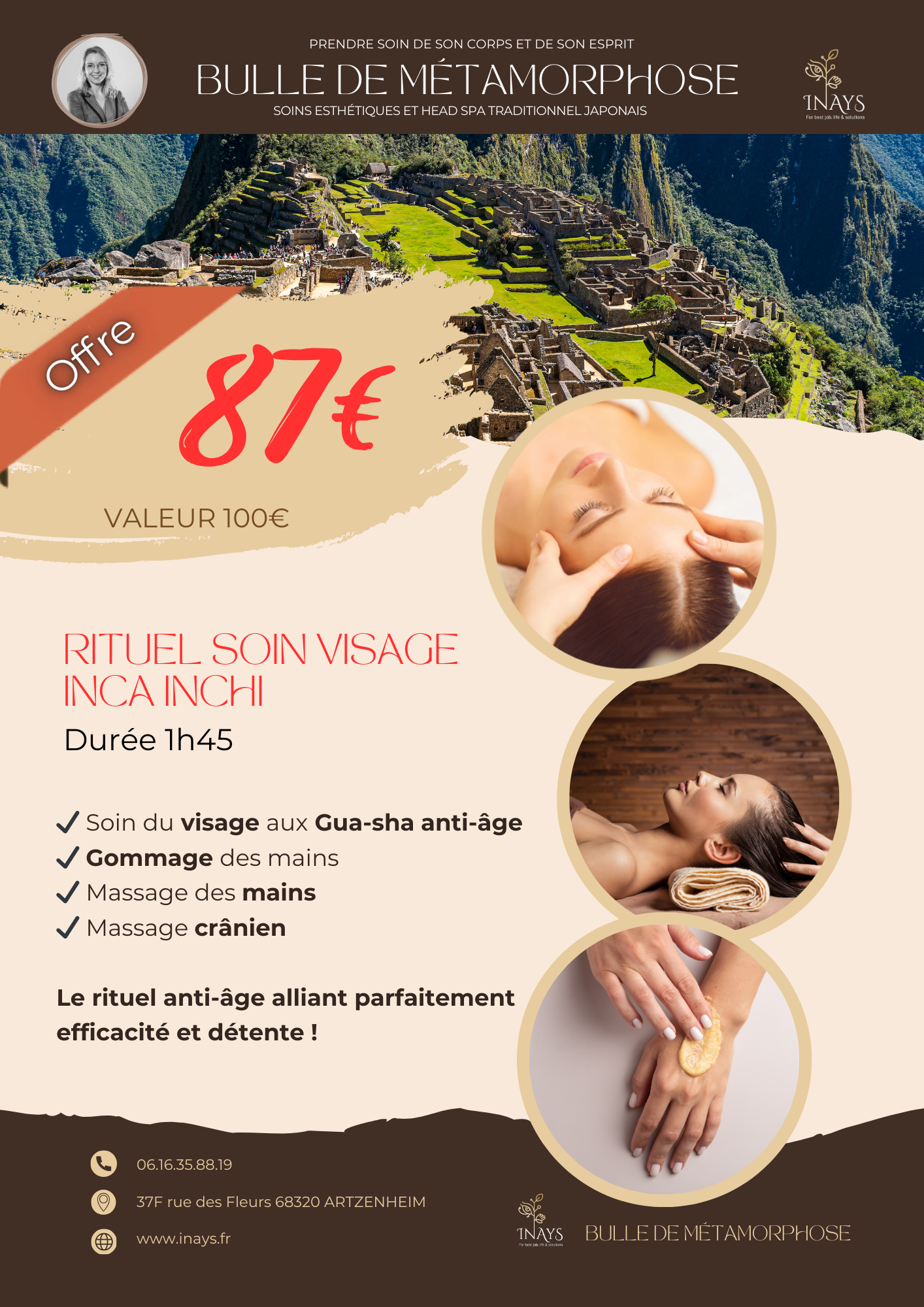 L’ambiance chaleureuse et apaisante d’Inays vous permettra de vous évader du stress quotidien, notamment grâce au véritable protocole Head Spa japonais, et de vous détendre dans un environnement paisible et confortable. Que vous soyez à la recherche d’un moment de détente en solo, de prendre soin de vous ou de vous offrir des prestations qui vous laisseront resplendissante de beauté, vous trouverez tout ce dont vous avez besoin pour passer un agréable moment au sein de notre institut à Artzenheim.